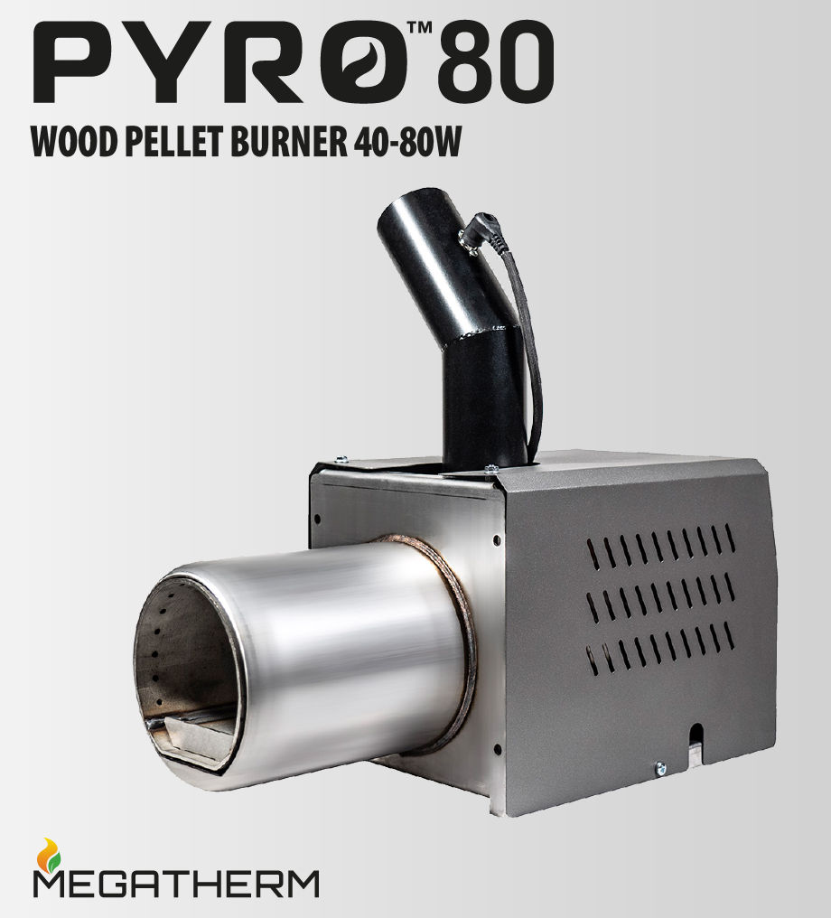 Megatherm Pyro 80 kW, suruõhuga puhastamise valmidus. Komplektis on põleti, kontroller REG-03 ja etteandetigu 1,5 m.